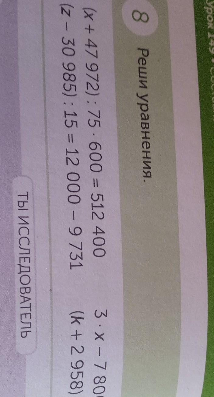 8 Реши уравнения. (x+47 972): 75 600 = 512 400 (z-30 985): 15 = 12 000 - 9731 пжжжж