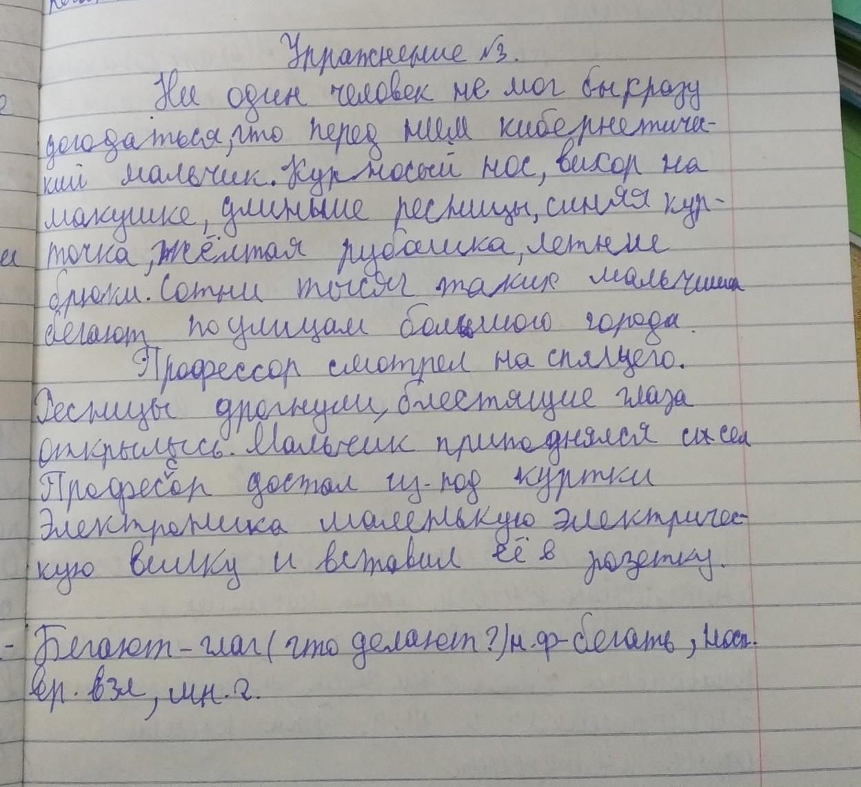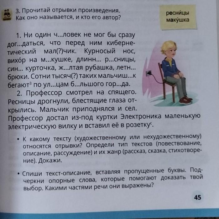 3. Прочитай отрывки произведения. Как оно называется, и кто его автор? 1. Ни один ч...ловек не мог бы сразу дог...даться, что перед ним киберне- тический мал(?)чик. Курносый нос, вихóр на м...кушке, длинн... р...сницы, син... курточка, ж...лтая рубашка, летн... брюки. Сотни тысяч(?) таких мальчиш...к бегают3 по ул...цам б...льшого гор...да. ресницы макушка 2. Профессор смотрел на спящего. Ресницы дрогнули, блестящие глаза от- крылись. Мальчик приподнялся и сел. Профессор достал из-под куртки Электроника маленькую электрическую вилку и вставил её в розеткус. • К какому тексту (художественному или нехудожественному) относятся отрывки? Определи тип текстов (повествование, описание, рассуждение) и их жанр (рассказ, сказка, стихотворе- ние). Докажи. • Спиши текст-описание, вставляя пропущенные буквы. Под- черкни опорные слова, которые помогают доказать твой выбор. Какими частями речи они выражены?
