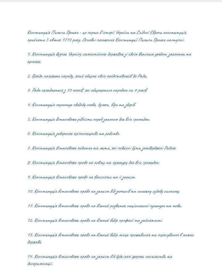 Конституція обмежувала привілеї гетьмана та старшини, вирівнювала козаків у правах, зберігаючи при цьому окремий статус запорожців. Окрім того, передбачала політичну незалежність України від Московії та розбудову незалежної української Церкви. Конституція вперше запропонувала розподіл влади на окремі гілки.