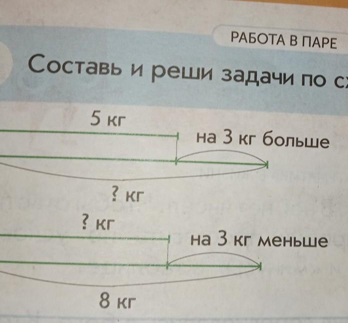 РАБОТА В ПАРЕ 3 Составь и реши задачи по схемам. 5 кг ? кг 8 кг на 3 кг больше на 3 кг меньше