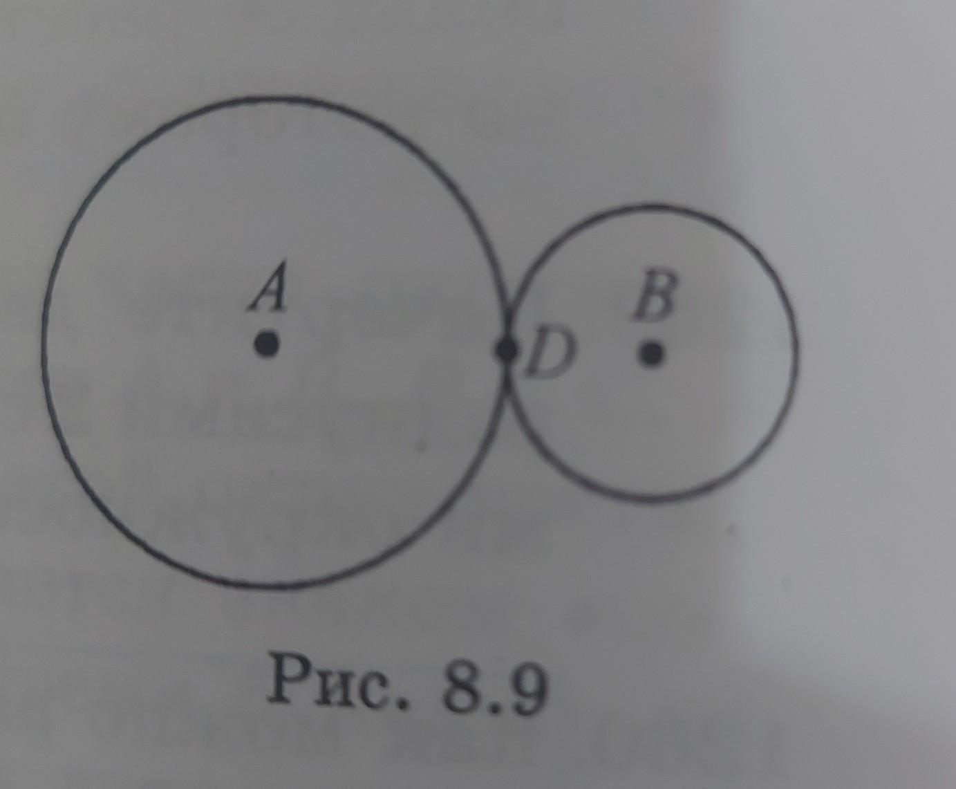Диаметр окружности с центром в точке А равен 6 см (рис. 8.9). Расстояние меж- ду точками А и В равно 5 см. Точка D - общая точка этих окружностей. Найдите диаметр окружности с центром в точке В. Как расположены эти две окружности относительно друг друга?
