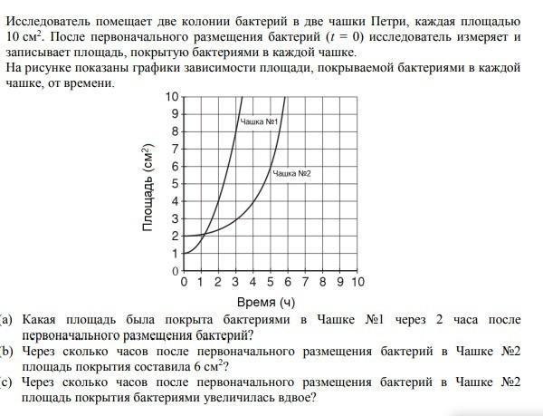 ПОМОГИТЕ ПЖ ДАМ 20 БАЛЛОВ Исследователь помещает две колонии бактерий в две чашки Петри, каждая площадью 10 см². После первоначального размещения бактерий (t = 0) исследователь измеряет и записывает площадь, покрытую бактериями в каждой чашке. На рисунке показаны графики зависимости площади, покрываемой бактериями в каждой чашке, от времени 2 часа после первоначального размещения бактерий? b) Через сколько часов после первоначального размещения бактерий в чашке №2 площадь покрытия составила б см²? c) Через сколько часов после первоначального размещения бактерий в Чашке №2 площадь покрытия бактериями увеличилась вдвое?. Площадь (см2) 10 9 43W L86 7 0 5 4 2 1 Чашка No1 Чашка №2 0 0 1 2 3 4 5 6 7 8 9 10 Время (ч) а) Какая площадь была покрыта бактериями в чашке №ol через