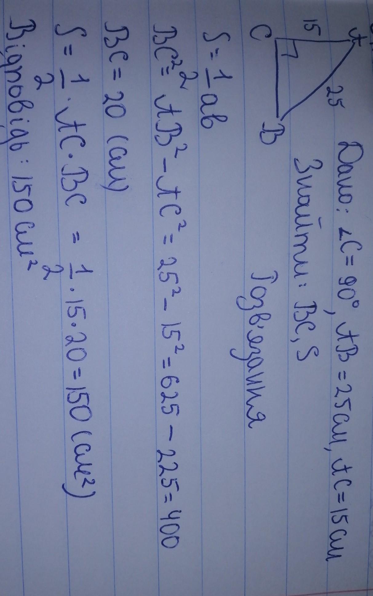 Обчисліть площу прямокутного трикутника один із катетів якого дорівнює 15 см, а гіпотенуза - 25 см.