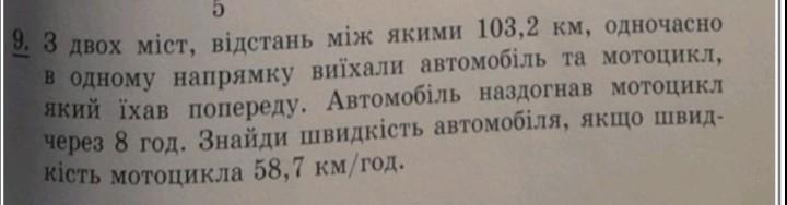3 двох міст, відстань між якими 103,2 км, одночасно в одному напрямку виїхали автомобіль та мотоцикл, який їхав попереду. Автомобіль наздогнав мотоцикл через 8 год. Знайди швидкість автомобіля, якщо швид- кість мотоцикла 58,7 км/год.