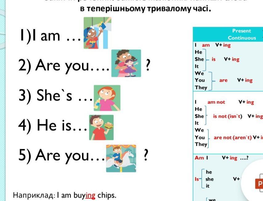 Закінчи речення. Замість малюнків напиши слова в теперішньому тривалому часі.