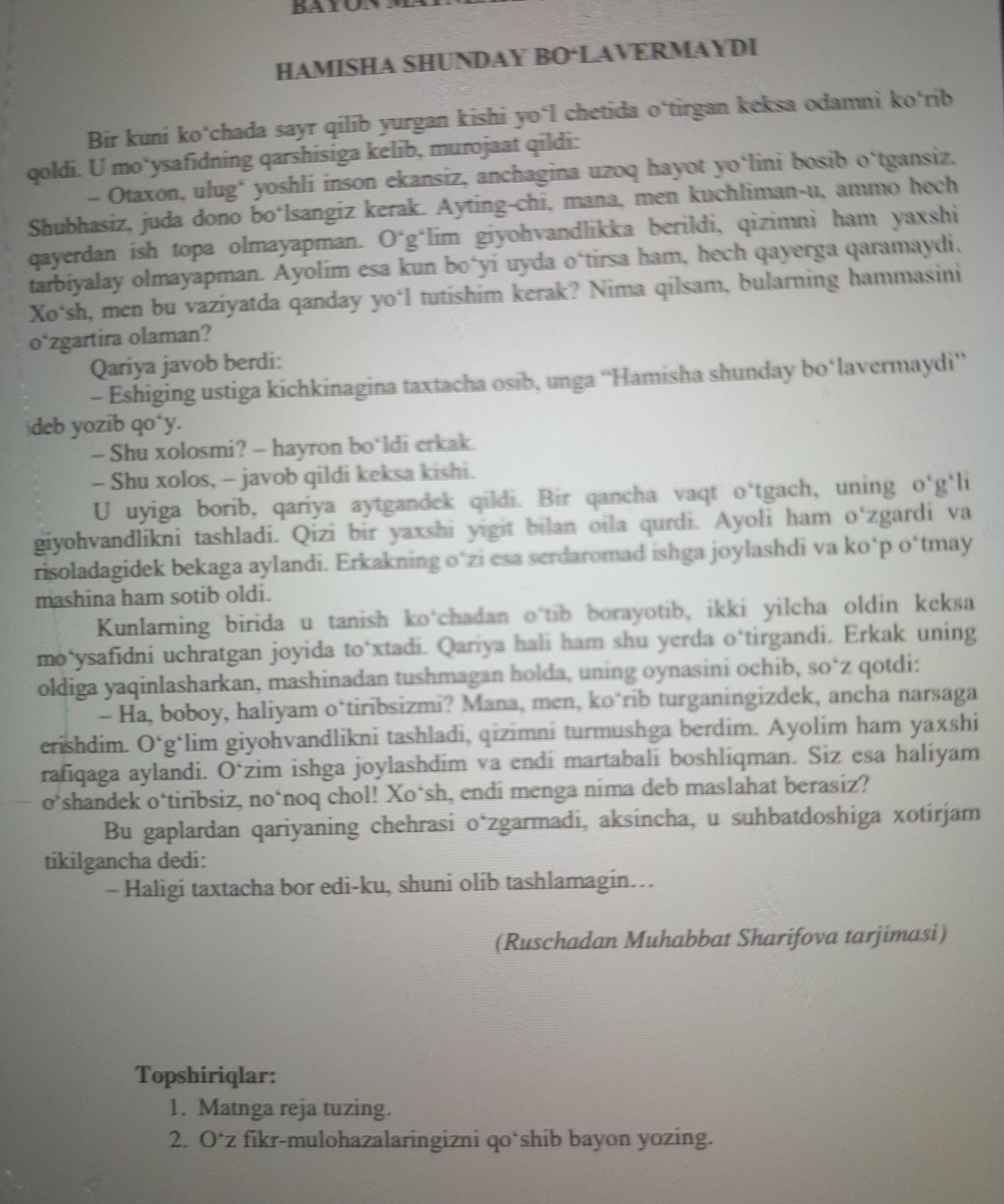 1.Keksa kishining maslahati. 2."Hamisha shunday bo'lavermaydi". 3.Manmansiragan "yangi"