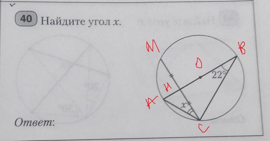 Дано:ΔАВС, Окружность с центром в точке О описанная, АВ=d, МН=НС, ∠АВС=22°