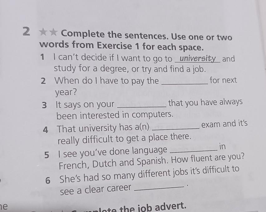 2 Complete the sentences. Use one or two words from Exercise 1 for each space. 1 I can't decide if I want to go to university and study for a degree, or try and find a job. When do I have to pay the year? 2 for next 3 It says on your that you have always been interested in computers. 4 That university has a(n) really difficult to get a place there. exam and it's 5 I see you've done language in French, Dutch and Spanish. How fluent are you? 6 She's had so many different jobs it's difficult to see a clear career