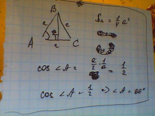 Стороны равностороннего треугольника AB=AC=a,но площадь треугольника одна четвертая а в квадрате. Найдите угол A.