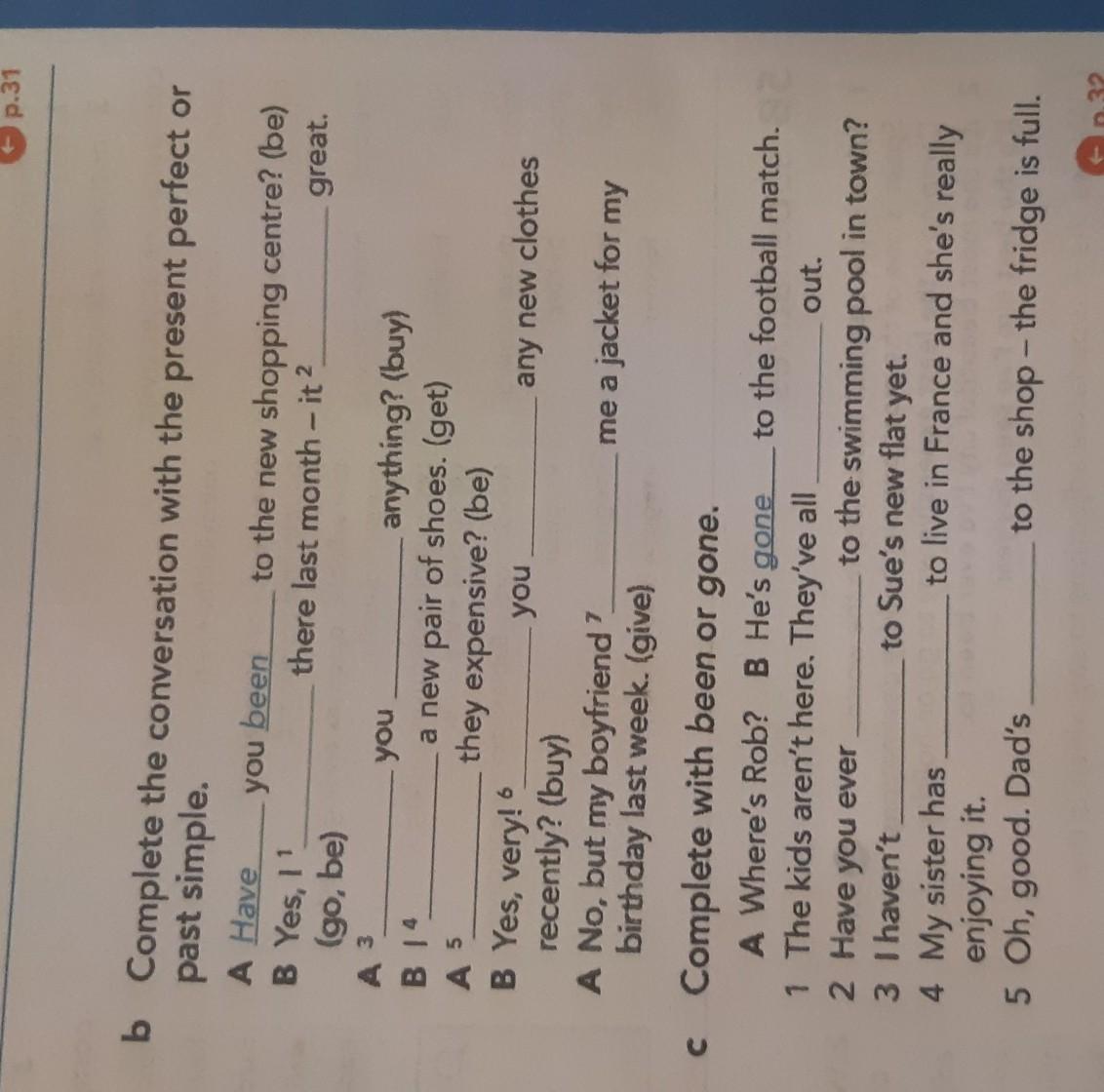 b Complete the conversation with the present perfect or past simple. A Have B Yes, I ¹ 1 (go, be) you been A 3 B14 A 5 B Yes, very! 6 to the new shopping centre? (be) there last month -it 2 great. recently? (buy) you a new pair of shoes. (get) they expensive? (be) you anything? (buy) A No, but my boyfriend 7. birthday last week. (give) c Complete with been or gone. A Where's Rob? B He's gone 1 The kids aren't here. They've all 2 Have you ever 3 I haven't 4 My sister has enjoying it. 5 Oh, good. Dad's any new clothes me a jacket for my to the football match. out. to the swimming pool in town? to Sue's new flat yet. to live in France and she's really to the shop - the fridge is full.