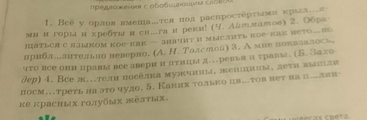 ve 531. Спиши, вставляя пропущенные буквы, расставляя недостающие знаки препинания при однородных членах предложения с обобщающим словом. 1. Всё у орлов вмеща...тся под распростёртыми крыл...я- и горы и ться хребты и сн... и еки. (Ч. Айтматов) 2. Обра- с языком кое-как - значит и мыслить кое-как нето...но бл...зительно неверно. (А. Н. Толстой) 3. А мне показалось, все они правы все звери и птицы д...ревья и травы. (Б. Захо 14. Все ж...тели посёлка мужчины, женщины, дети вышли л...треть на это чудо. 5. Каких только цв... тов нет на п...лян- расных голубых жёлтых.