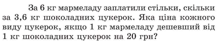 Нехай 1 кг мармеладу коштує х грн. Тоді 1 кг шоколадних цукерок коштує (× + 20) грн.