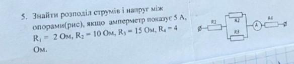5. Знайти розподіл струмів і напруг між опорами(рис), якщо амперметр показує 5 А. R1 = 2 OM, R2 = 10 OM, R, - 15 Ом, R-4 Ом.