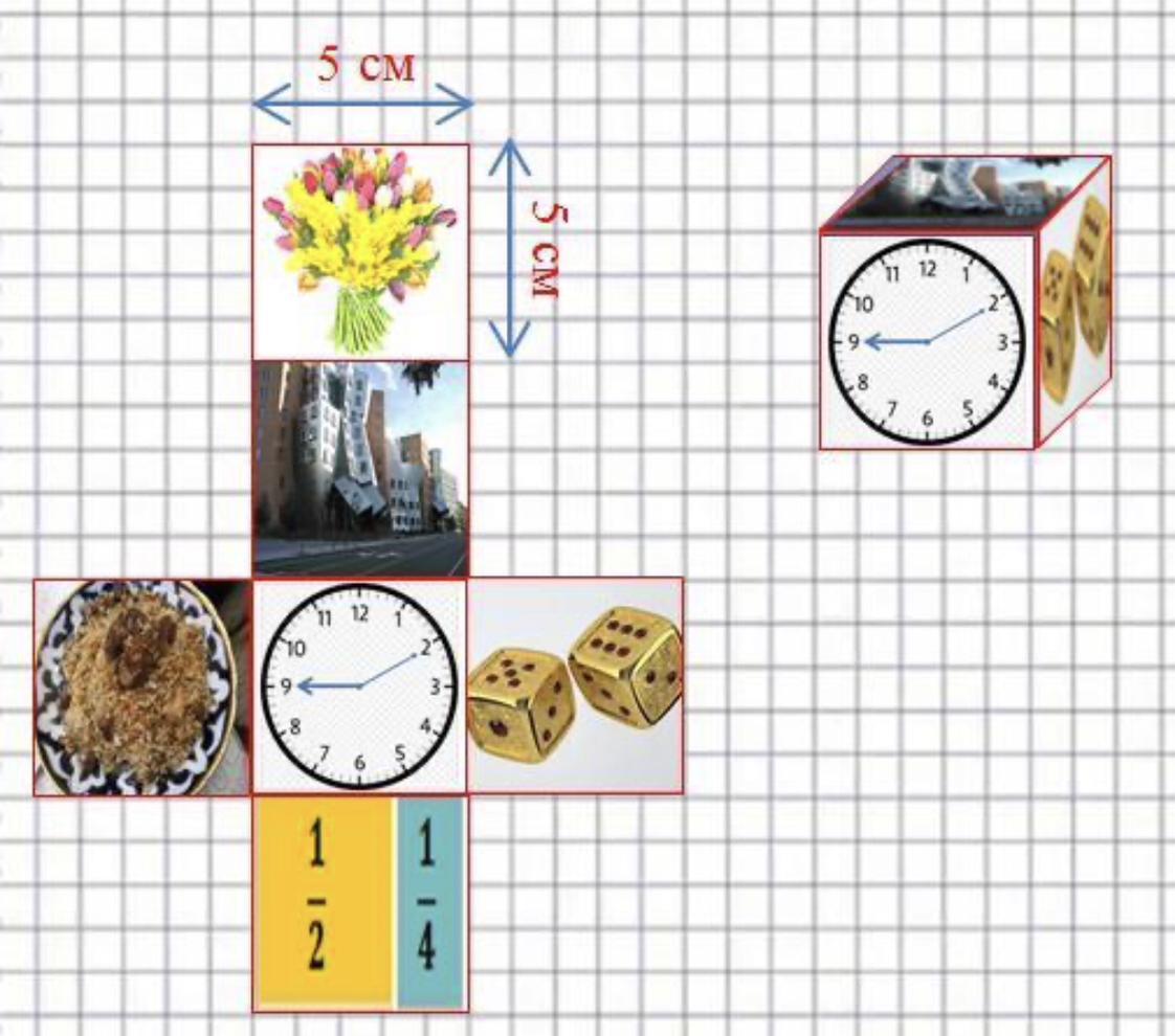 В Упражнения 925. Начертите развертку куба, длина стороны которого равна 5 см. Наклейте на его грани картинки (или нарисуйте на его гранях: буквы, цифры и др.). Изготовьте куб.