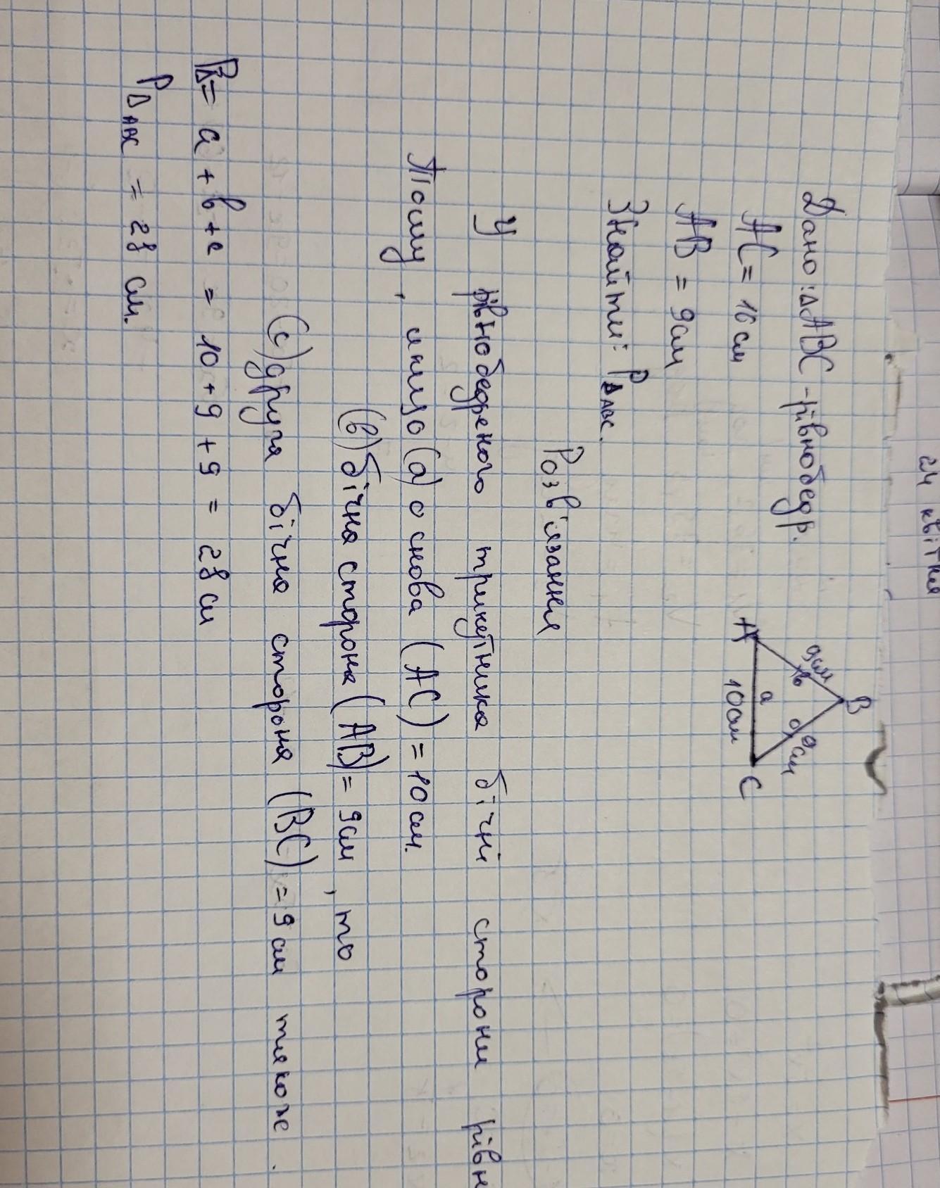 можливо. 2.(16) Знайдіть периметр рівнобедреного трикутника, основа якого дорівнює 10 см, а бічна сторона 9 см.