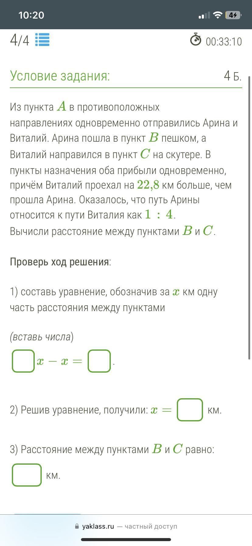 Из пункта А в противоположных Виталий направился в пункт С на скутере. В пункты назначения оба прибыли одновременно, причём Виталий проехал на 22,8 км больше, чем прошла Арина. Оказалось, что путь Арины относится к пути Виталия как 1: 4. Вычисли расстояние между пунктами В и С.