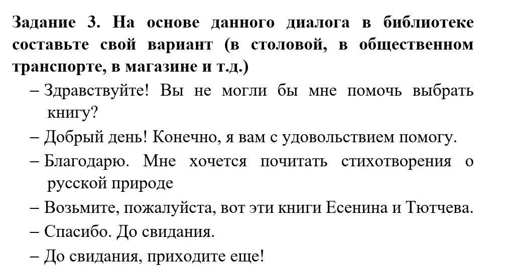 Задание 3. На основе данного диалога в библиотеке составьте свой вариант (в столовой, в общественном транспорте, в магазине и т.д.) — Здравствуйте! Вы не могли бы мне помочь выбрать книгу? - Добрый день! Конечно, я вам с удовольствием помогу. — Благодарю. Мне хочется почитать стихотворения о русской природе – Возьмите, пожалуйста, вот эти книги Есенина и Тютчева. - Спасибо. До свидания. — До свидания, приходите еще!
