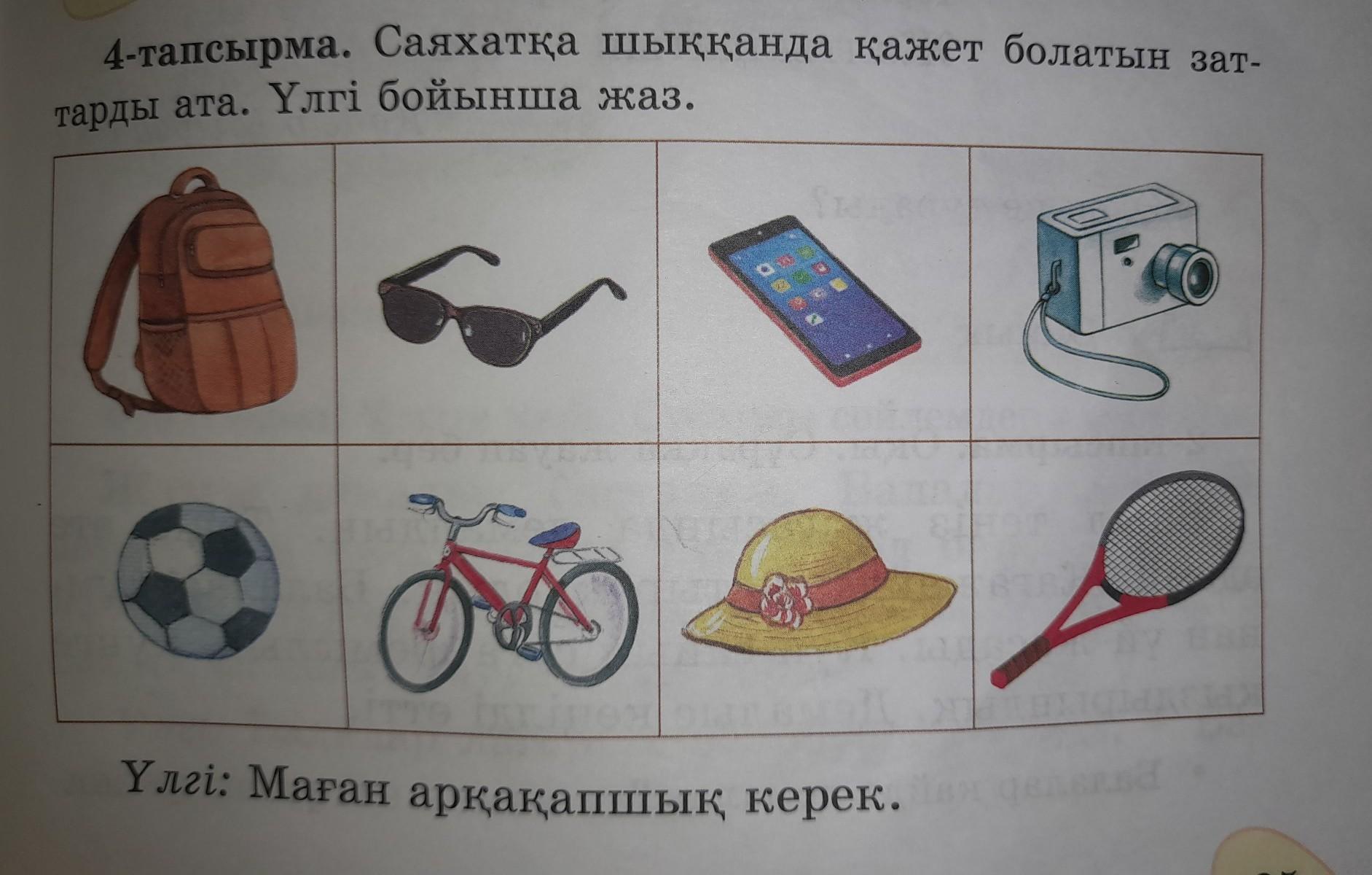 сөмке,Маған күнге көзім көру үшін көзілдірік керек,Мен адасып қалмау үшін телефон керек,Мен көп затты суретке түсіру үшін фотофарат керек