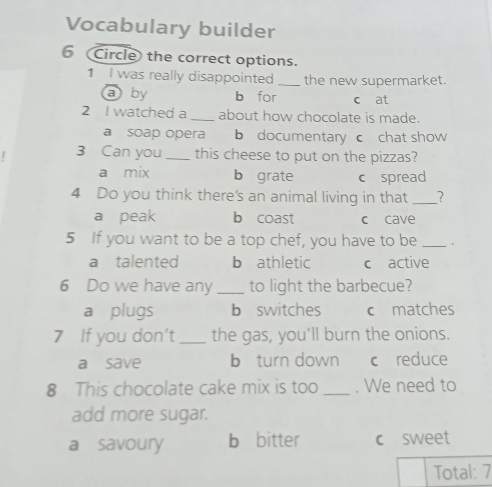 Vocabulary builder 6 Circle the correct options. 1 I was really disappointed a by b for I watched a about how chocolate is made. с at a soap opera Can you a mix b documentary c chat show this cheese to put on the pizzas? b grate Do you think there's an animal living in that c spread peak b coast a с cave 5 If you want to be a top chef, you have to be talented b athletic C active a 2 3 4 6 the new supermarket. Do we have any to light the barbecue? a plugs b switches c matches 7 If you don't the gas, you'll burn the onions. b turn down a save c reduce 8 This chocolate cake mix is too. We need to add more sugar. a savoury ? b bitter c sweet Total: 7