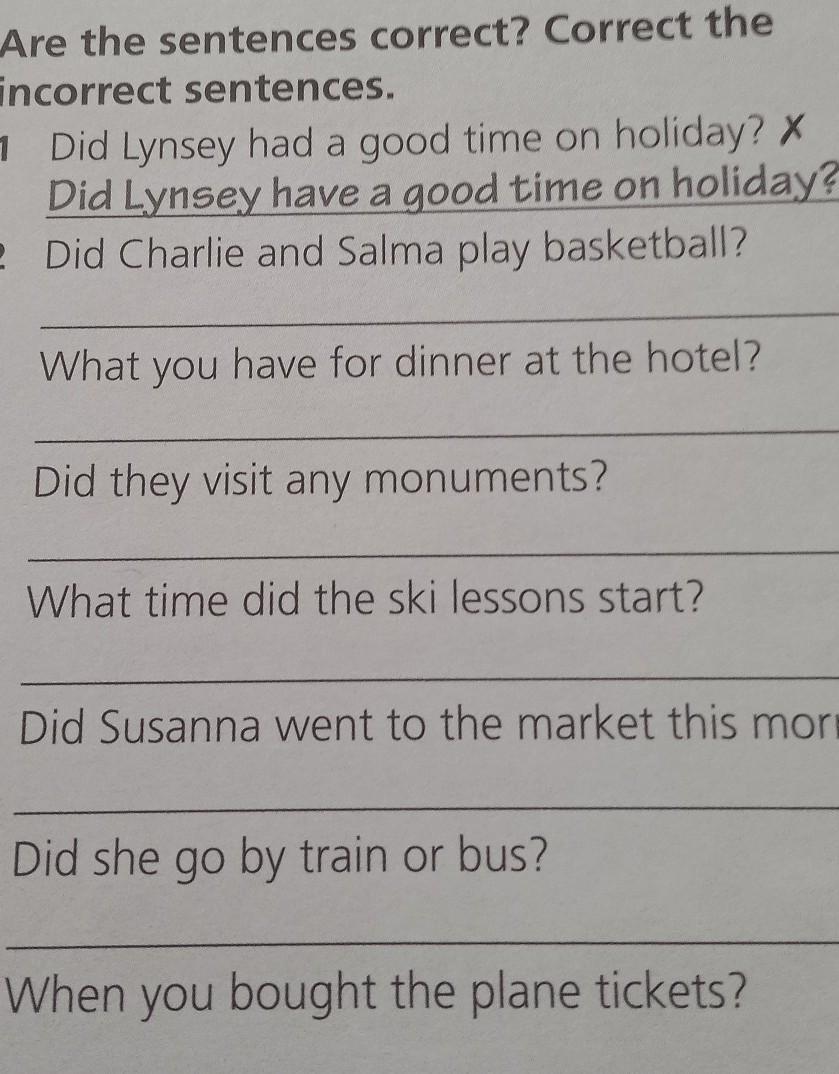 1 Are the sentences correct? Correct the incorrect sentences. 1 Did Lynsey had a good time on holiday? X Did Lynsey have a good time on holiday? Did Charlie and Salma play basketball? 2 3 What you have for dinner at the hotel? 4 Did they visit any monuments? 5 What time did the ski lessons start? 6 Did Susanna went to the market this morning? 7 Did she go by train or bus? 8 When you bought the plane tickets? хэлп
