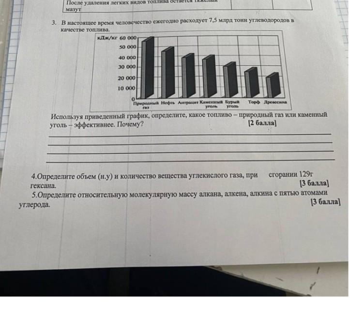 3. В настоящее время человечество ежегодно расходует 7,5 млрд тонн углеводородов в качестве топлива. углерода. кДж/кг 60 000 50 000 40 000 30 000 20 000 10 000 0 Природный Нефть Антрацит Камсоя Бурый Торф Древесина 783 уголь уголь Используя приведенный график, определите, какое топливо - природный газ или каменный уголь - эффективнее. Почему? (2 балла) 4.Определите объем (н.у) и количество вещества углекислого газа, при гексана. сгорании 129г [3 балла) 5.Определите относительную молекулярную массу алкана, алкена, алкина с пятью атомами [3 балла