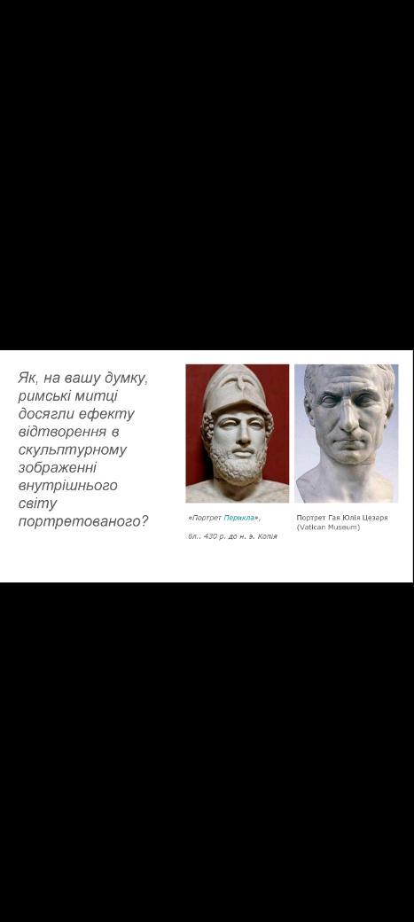 Римські митці в досягненні ефекту відтворення внутрішнього світу портретованого використовували різні методи. Один з найважливіших методів полягав у вираженні певних емоцій через вираз обличчя і позу тіла. Римські скульптори також намагалися передати риси характеру та особистості портретованої особи, такі як сміливість, мужність, розумність, скромність та інші. Крім того, вони використовували техніки для відтворення деталей, таких як волосся, одяг і прикраси, що додавало реалістичності їхнім творінням. Всі ці методи допомагали римським митцям відтворити внутрішній світ портретованих осіб, надаючи їхнім роботам глибини і значення.