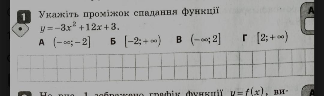 Это парабола, ветви вниз, значит от х вершины до бесконечности. х вершины=-b/2a=-12/(2*(-3))=2; Ответ г)