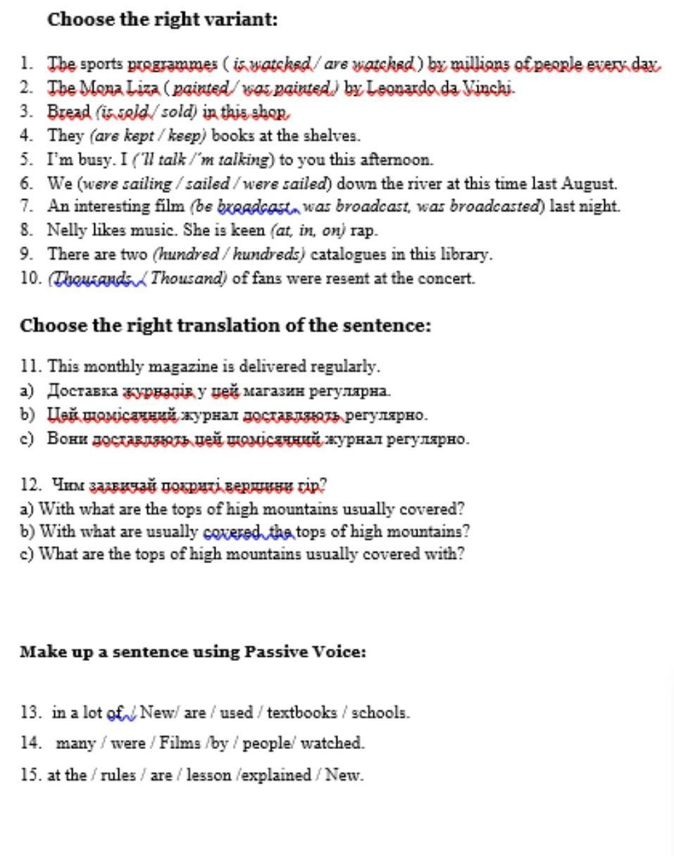 Choose the right variant: 1. The sports programmes (is watched/ are watched) by millions of people every dax 2. The Mona Liza (painted/vos painted) by Leonardo da Vinchi. 3. Bread (is sald/sold) in this shop 4. They (are kept/keep) books at the shelves. 5. I'm busy. I ('ll talk/'m talking) to you this afternoon. 6. We (were sailing/sailed/were sailed) down the river at this time last August. 7. An interesting film (be broadcast, was broadcast, was broadcasted) last night. 8. Nelly likes music. She is keen (at, in, on) rap. 9. There are two (hundred/hundreds) catalogues in this library. 10. Thousands Thousand) of fans were resent at the concert. Choose the right translation of the sentence: 11. This monthly magazine is delivered regularly. а) Доставка журналів у цей магазин регулярна. b) Цей щомісанний журнал доставляють регулярно. с) Вони доставляють ней момiсанний журнал регулярно. 12. Чим зазвичай покриті вершини гір? a) With what are the tops of high mountains usually covered? b) With what are usually covered the tops of high mountains? c) What are the tops of high mountains usually covered with? Make up a sentence using Passive Voice: 13. in a lot of New/ are/used/textbooks/schools. 14. many / were / Films/by/people/ watched. 15. at the/rules/ are/lesson /explained / New.