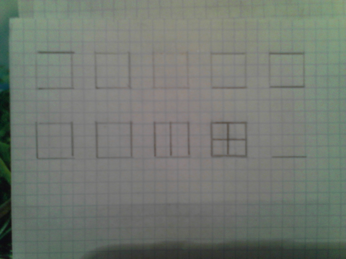 Склади з паличок конструкцію, зображену на малюнку (5 квадратів з паличок). Переклади 3 палички так, щоб утворилося 9 квадратів ? Намалюй новий варіант конструкції.