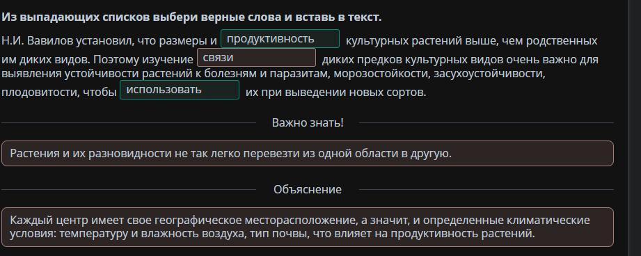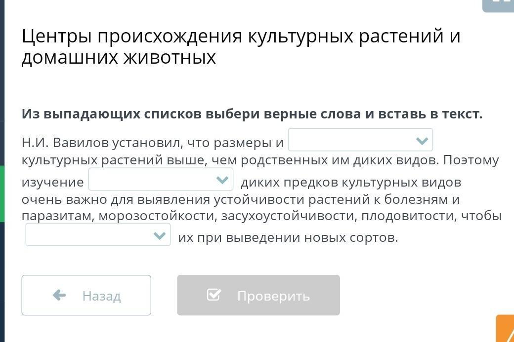Центры происхождения культурных растений и домашних животных Из выпадающих списков выбери верные слова и вставь в текст. Н.И. Вавилов установил, что размеры и культурных растений выше, чем родственных им диких видов. Поэтому изучение диких предков культурных видов очень важно для выявления устойчивости растений к болезням и паразитам, морозостойкости, засухоустойчивости, плодовитости, чтобы + Назад их при выведении новых сортов. Проверить