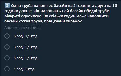 скажемо що швидкіть першої труби а1 л/год а другої а2 л/год а також що за ч годин обидві труби повністю наповняють басейн