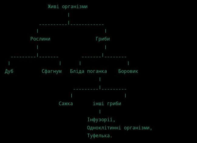Заповніть схему, правильно розмістивши в ній наведені поняття. Поняття: інфузорія туфелька, гриби, живі організми, одноклітинні організми, рослини, бліда поганка, боровик, сажка, сфагнум, дуб.
