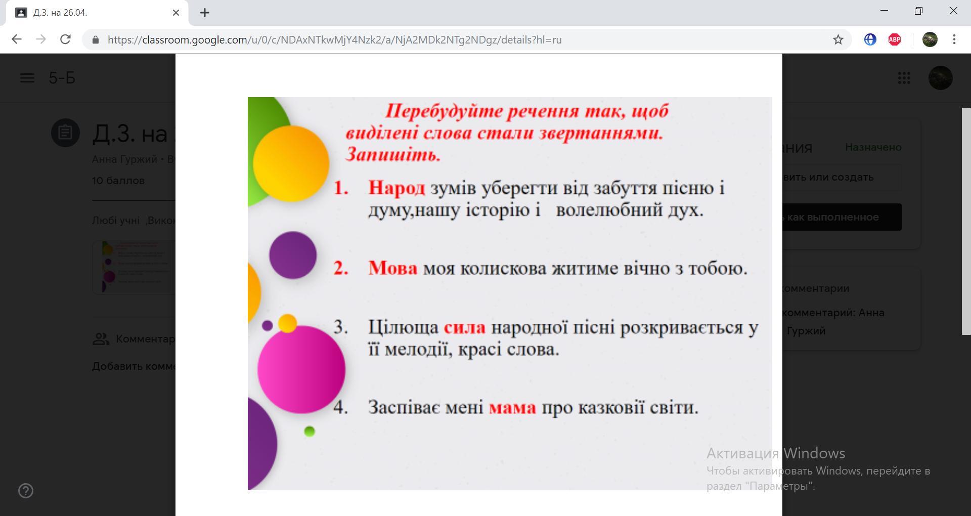 Ответ: 1) Народе, ти зумів уберегти від забуття пісню і думу, нашу історію, волелюбний дух. 2) Мово, моя колискова житиме вічно з тобою! 3) Сило цілуща народної пісні, ти розкриваєшся у її мелодії, красі слова. 4) Мамо, заспівай меня про казкові світи.