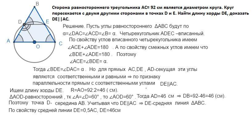 Сторона ,равностороннего треугольника ,AC= 92 см является диаметром круга. Круг пересекается с двумя другими сторонами в точках D и E.