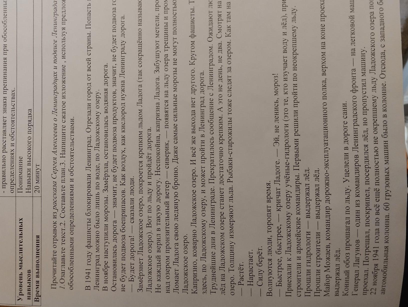 Прочитайте отрывок из рассказа Сергея Алексеева о Ленинградцах и подвиге Лен 1. Озаглавьте текст.2. Составьте план.3. Напишите сжатое изложение, используя с обособленными определениями и обстоятельствами. - В 1941 году фашисты блокировали Ленинград. Отрезали город от всей страны. П Ленинград можно было лишь по воде, по Ладожскому озеру. В ноябре наступили морозы. Замёрзла, остановилась водяная дорога. Остановилась дорога значит, не будет подвоза продуктов, значит, не будет по не будет подвоза боеприпасов. Как воздух, как кислород нужна Ленинграду дор Будет дорога! сказали люди. - Замёрзнет Ладожское озеро, покроется крепким льдом Ладога (так сокращённо Ладожское озеро). Вот по льду и пройдëт дорога. Не каждый верил в такую дорогу. Неспокойна, капризна Ладога. Забушуют мет над озером пронзительный ветер сиверик, появятся на льду озера трещин Ломает Ладога свою ледяную броню. Даже самые сильные морозы не могут пс Ладожское озеро. Капризно, коварно Ладожское озеро. И всё же выхода нет другого. Кругом фа здесь, по Ладожскому озеру, и может пройти в Ленинград дорога. Труднейшие дни в Ленинграде. Прекратилось сообщение с Ленинградом. Ож лёд на Ладожском озере станет достаточно крепким. А это не день, не два. См озеро. Толщину измеряют льда. Рыбаки-старожилы тоже следят за озером. Ка Растёт. Нарастает. Силу берёт. Волнуются люди, торопят время. - Быстрее, быстрее, кричат Ладоге. - Эй, не ленись, мороз! Приехали к Ладожскому озеру учёные-гидрологи (это те, кто изучает воду и строители и армейские командиры. Первыми решили пройти по неокрепше Прошли гидрологи - выдержал лёд. Прошли строители - выдержал лёд. Майор Можаев, командир дорожно-эксплуатационного полка, верхом на к выдержал лёд. Конный обоз прошагал по льду. Уцелели в дороге сани. на лег Генерал Лагунов - один из командиров Ленинградского фронта проехал. Потрещал, поскрипел, посердился лёд, но пропустил машину. 22 ноября 1941 года по всё ещё полностью не окрепшему льду Ладожског автомобильная колонна. 60 грузовых машин было в колонне. Отсюда, с за
