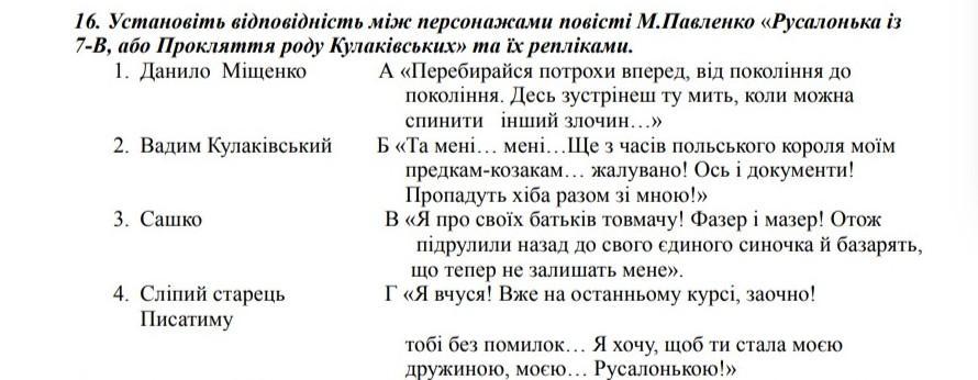 ДУЖЕ СРОЧНО Установіть відповідність між персонажами повісті М.Павленко «Русалонька із 7-B, або Прокляття роду Кулаківських» та їх репліками. 1. Данило Міщенко А⟪Перебирайся потрохи вперед, від покоління до покоління. Десь зустрінеш ту мить, коли можна спинити інший злочин...» 2. Вадим Кулаківський Б > 3. Сашко В