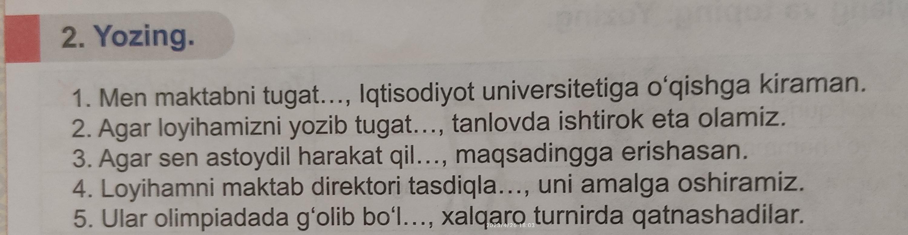1. Men maktabni tugatib, iqtisodiyot universitetiga oʻqishga kiraman