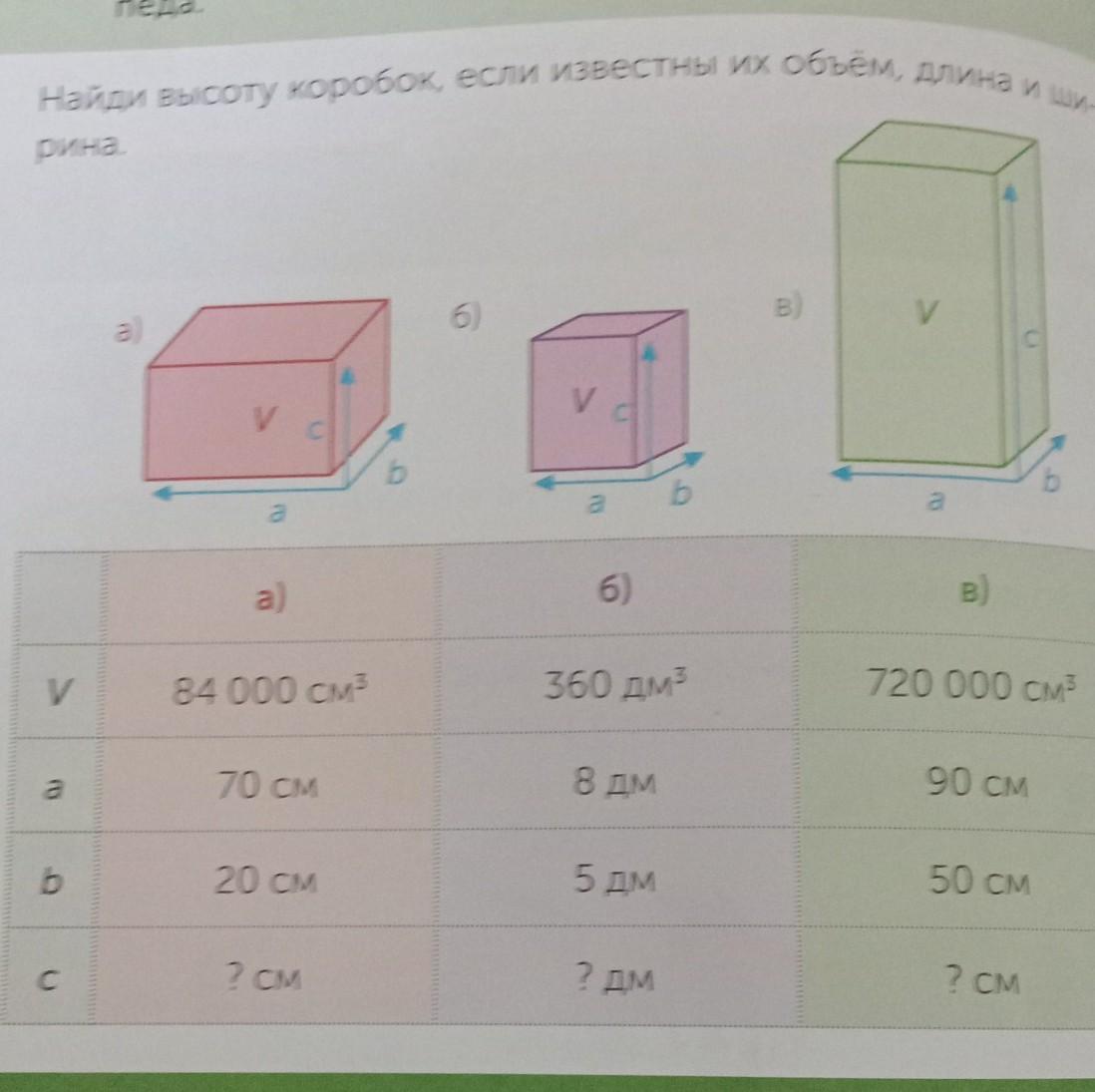 Найди высоту коробок, если известны их объём, длина и ши- рина. V a b с a) V a a) 84 000 см3 70 см 20 CM ? CM V a 6) b 360 дм3 8 ДМ 5 ДМ ? ДМ V a B) 720 000 CM3 90 см 50 CM ? CM pe AE 5 6 T