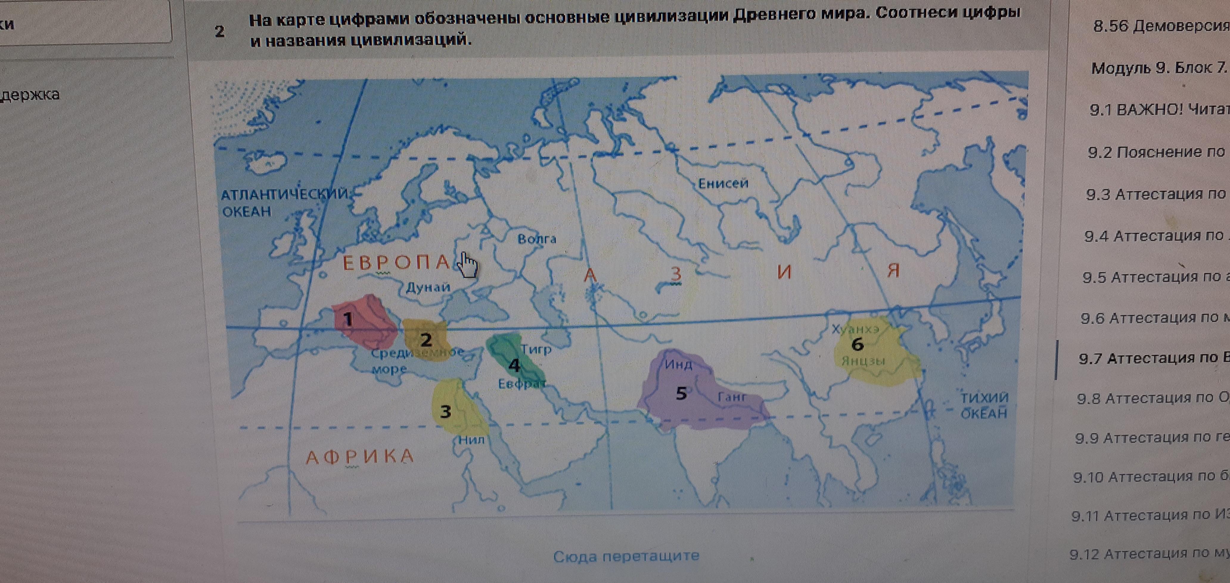 На карте цифрами обозначены основные цивилизации Древнего мира. Соотнеси цифры и названия цивилизаций.
