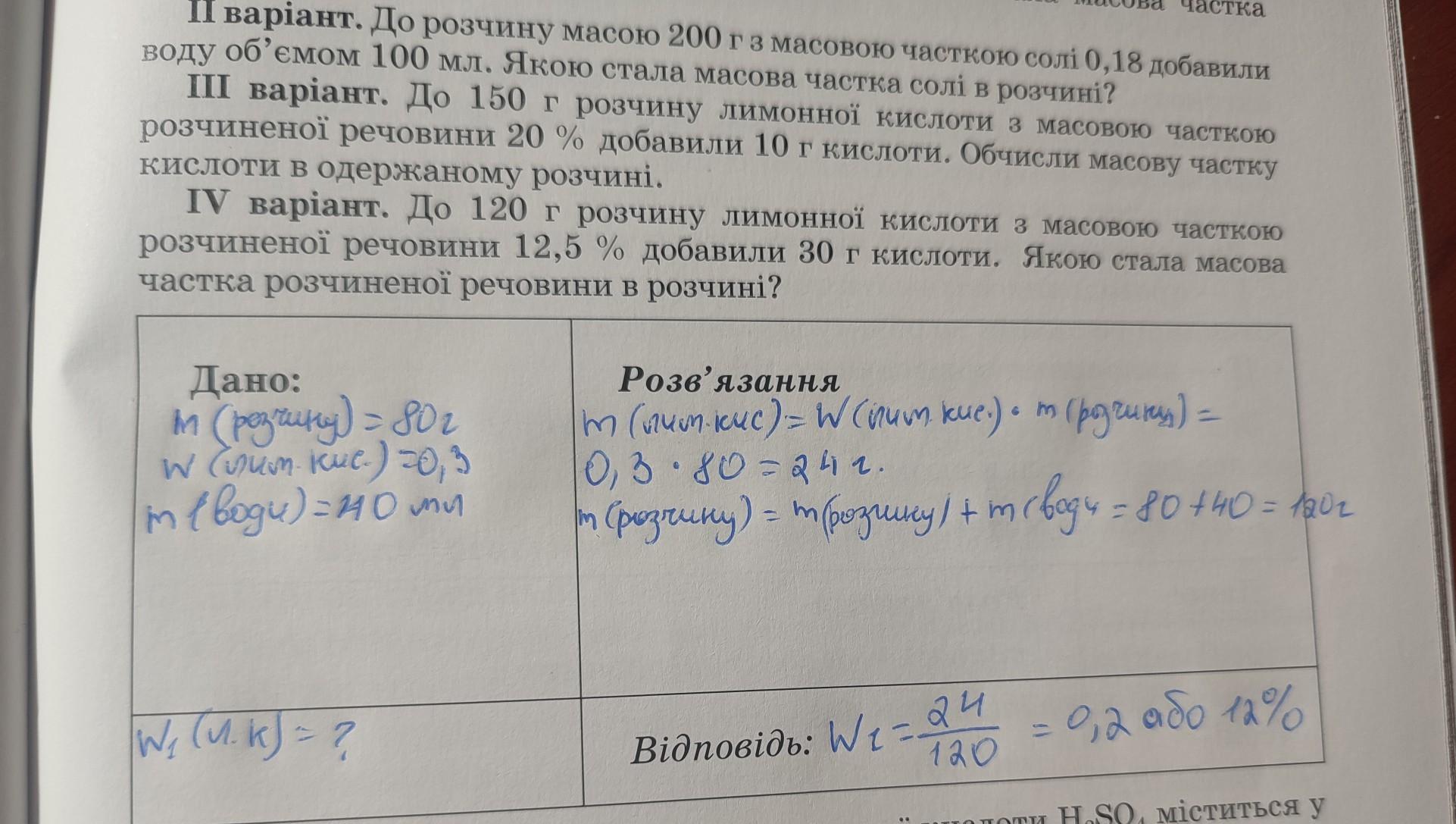 До розчину масою 80 г з масовою часткою лимонної кислоти 0,3 добавили воду об'ємом 40 мл. Якою стала масова частка кислоти в розчині?