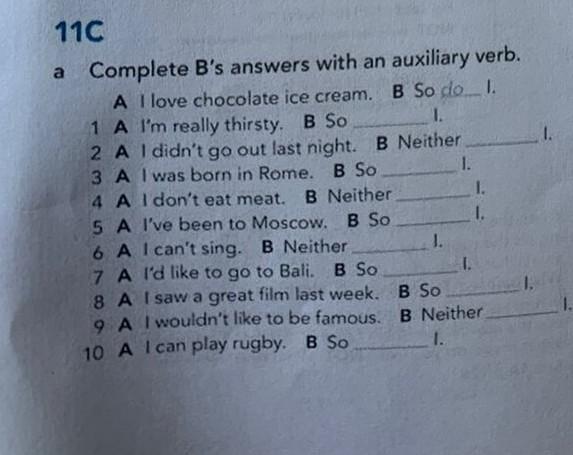 Complete B's answers with an auxiliary verb. A I love chocolate ice cream. B So do 1. 1. B Neither. 1 A I'm really thirsty. B So 2 A I didn't go out last night. 3 A I was born in Rome. B So 4 A I don't eat meat. B Neither 5 A I've been to Moscow. B So 6 A I can't sing. B Neither 7 A I'd like to go to Bali. B So J. 1. 1. 1. 1. 8 A I saw a great film last week. B So 9 A I wouldn't like to be famous. B Neither 10 A I can play rugby. B So 1.