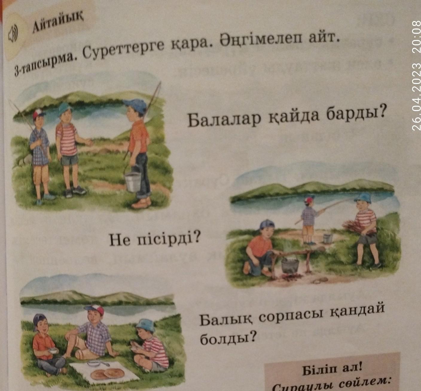Айтайык 3-тапсырма. Суреттерге кара. Әңгімелеп айт. Балалар кайда барды? Не пiсiрдi? Балык сорпасы кандай болды?
