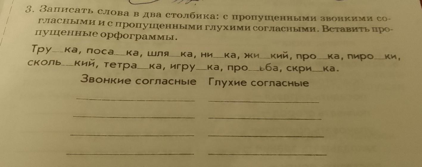 3. Записать слова в два столбика: с пропущенными звонкими со гласными и с пропущенными глухими согласными. Вставить про пущенные орфограммы. Tpy ка, поса ка, шпя ка, ни ка, жи кий, про ка, пиро ки сколь кий, тетра ка, игру ка, про ба, скри ка. Звонкие согласные Глухие согласные ее дона ПОМАГИТЕ ПОЖАЛУЙСТА