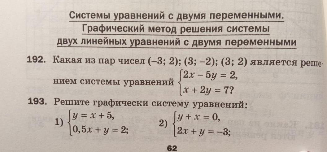 Системы уравнений с двумя переменными. Графический метод решения системы двух линейных уравнений с двумя переменными 192. Какая из пар чисел (-3; 2); (3; -2); (3; 2) является реше нием системы уравнений 2x-5у = 2, x+2y = 7? 193. Решите графически систему уравнений: |y + x = 0, |2x + y = -3; 1) y = x + 5, 10,5х + y = 2; 2) 62