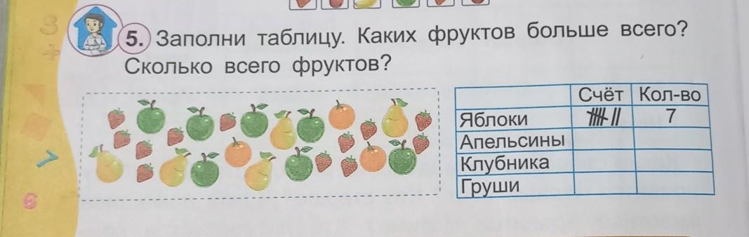 5. Заполни таблицу. Каких фруктов больше всего? Сколько всего фруктов? Яблоки Апельсины Клубника Груши Счёт Кол-во 7