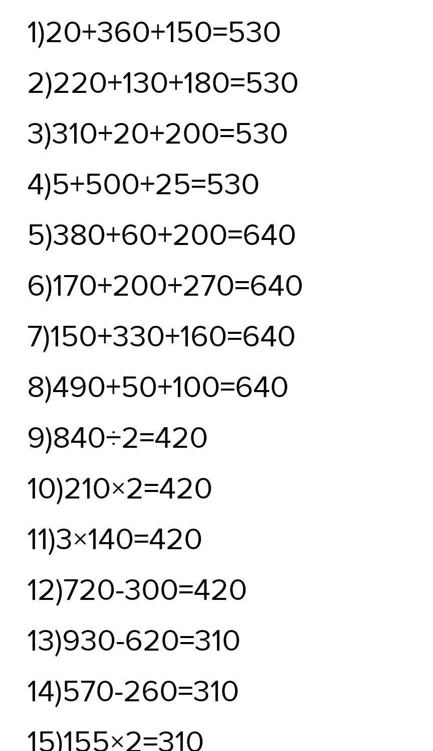 3. Вставь пропущенные числа. 530 640 20+ +150 380++ 200 +130+180 +200+270 310++200 150++ 160 +500+25 490++100 420 840: -210 ☐.140 720- 310 930- ☐-260 155- +18