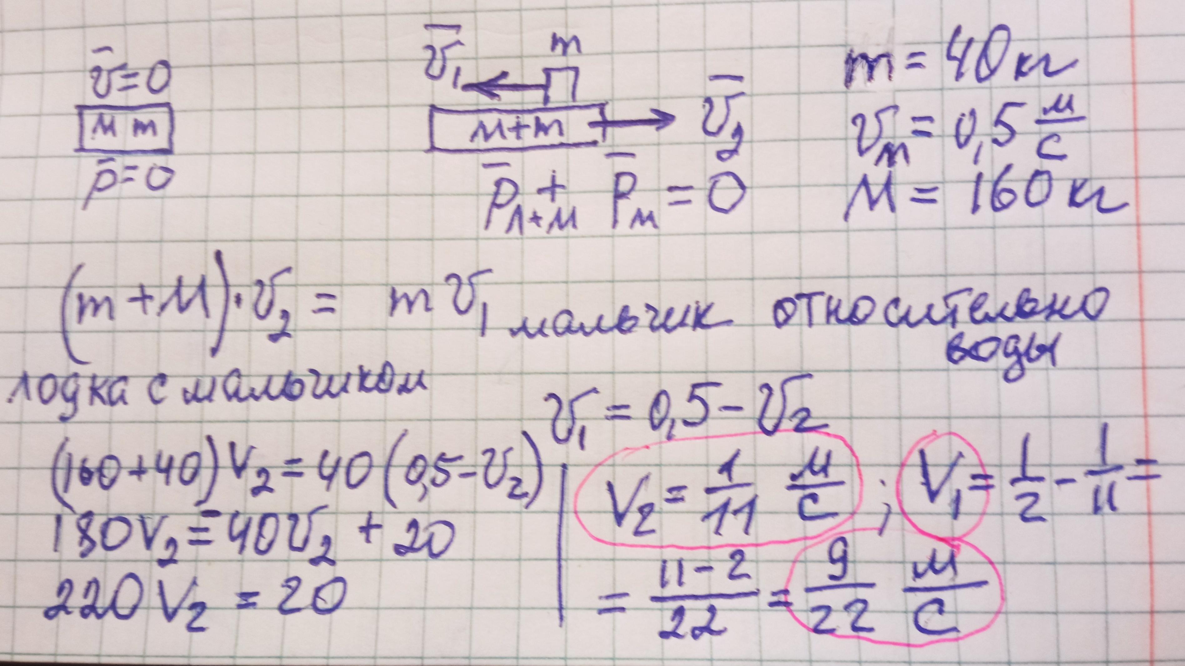 Мальчик массой 40 кг переходит из носа находящейся в озере лодки на корму со скоростью 0,5 м/с относительно лодки. С какими скоростями двигаются при этом лодка и мальчик сразу воды, если масса лодки