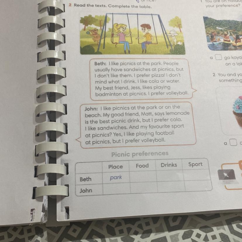 Beth: park, pizza, cola or water, volleyball