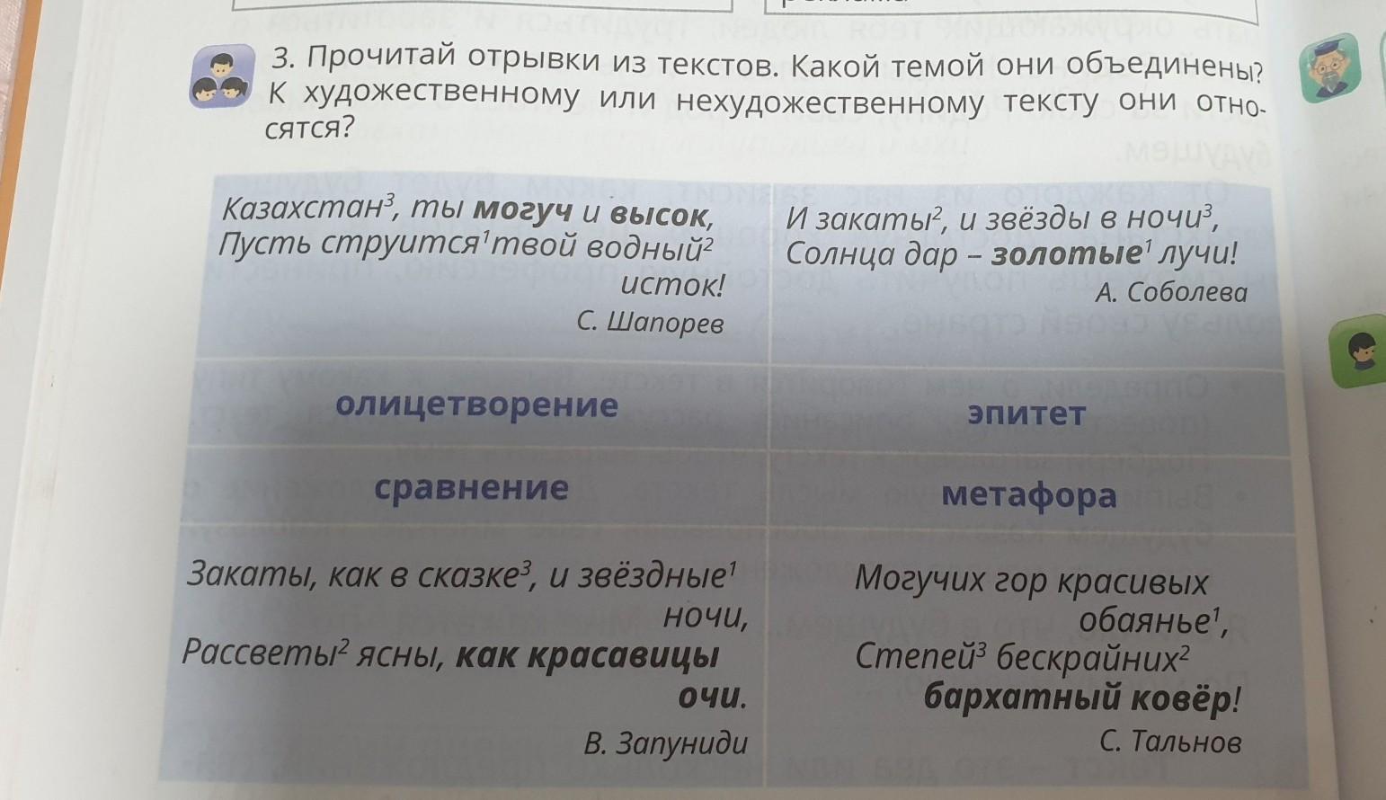 3. Прочитай отрывки из текстов. Какой темой они объединены? К художественному или нехудожественному тексту они ОТНО- сятся? Казахстан, ты могуч и высок, Пусть струится твой водный исток! С. Шапорев олицетворение сравнение Закаты, как в сказкез, и звёздные ночи, Рассветы² ясны, как красавицы очи. В. Запуниди И закаты?, и звёзды в ночиз, Солнца дар - золотые лучи! А. Соболева эпитет метафора Могучих гор красивых обаянье, Степейз бескрайних бархатный ковёр! С. Тальнов помогите,что надо делать??