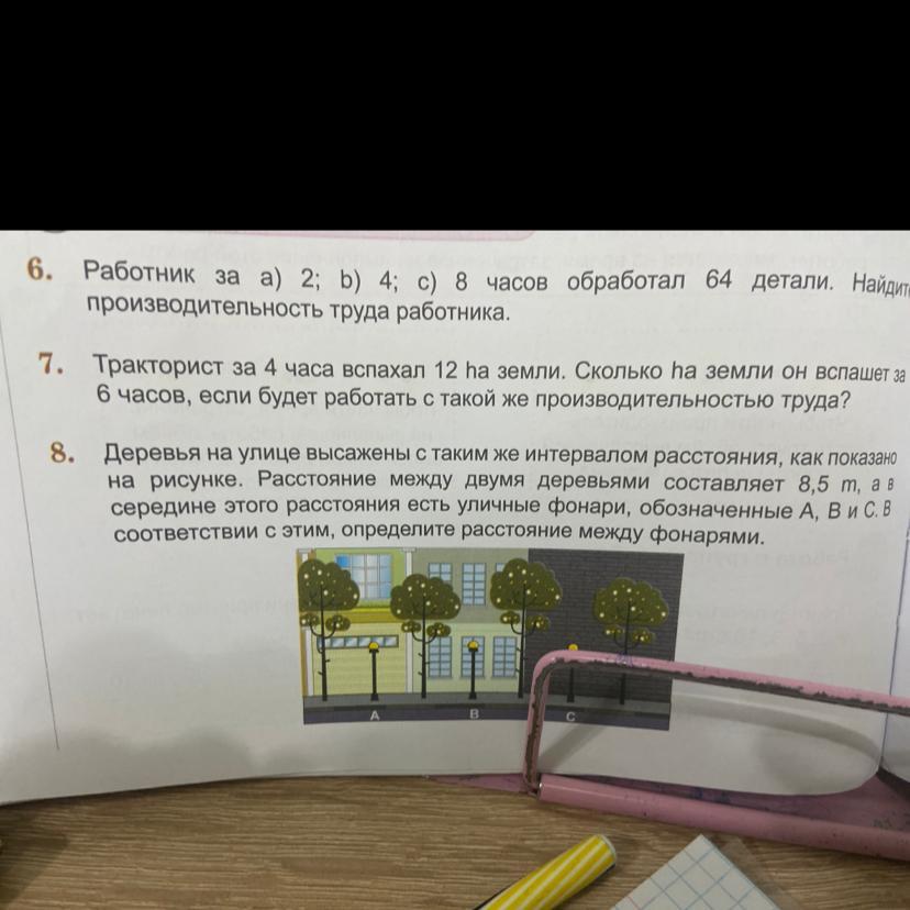 8,5метров написано, что столбы на половине от деревьев 8,5 делим на 2 но так как там 2 этих разницы, то получаеться так 8,5/2*2=8,5